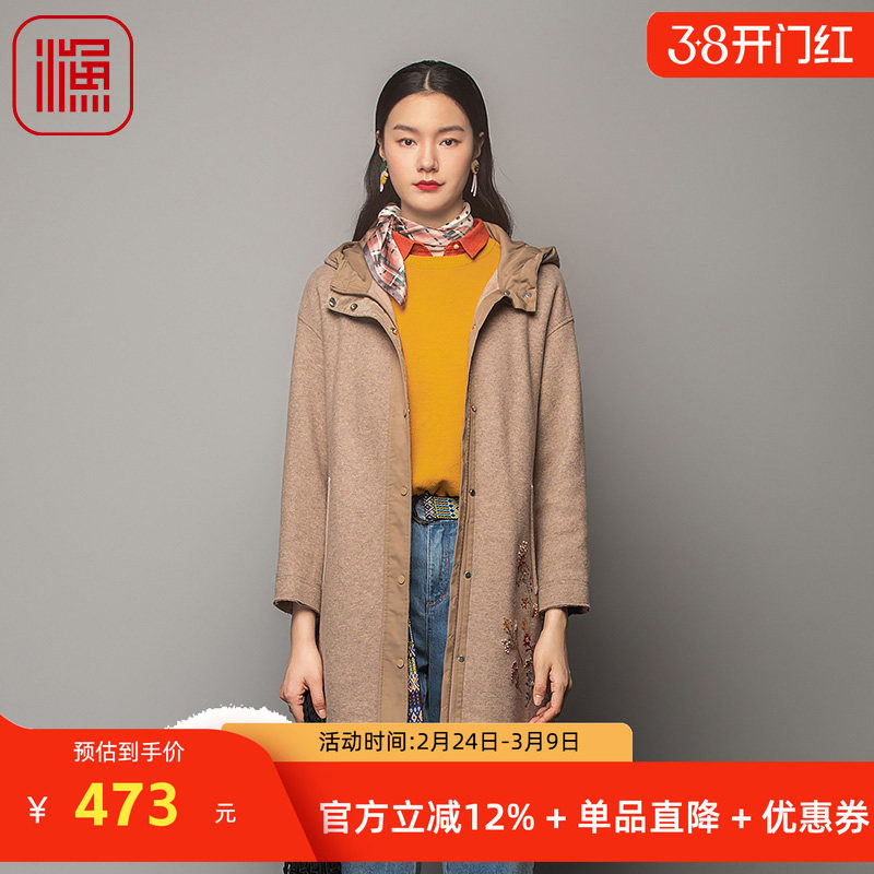 渔牌女装大衣女款2023新款加厚羊毛针织带帽长款毛呢外套FGFD3058