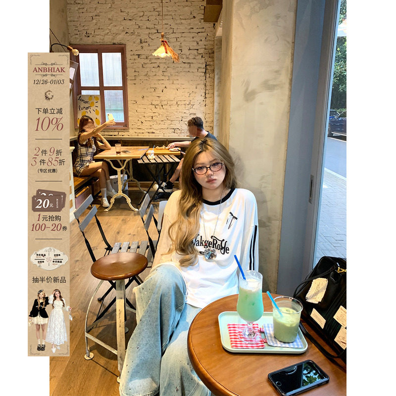 安妮不火 休闲风撞色印花云感棉针织T恤女秋微胖大码显瘦长袖上衣