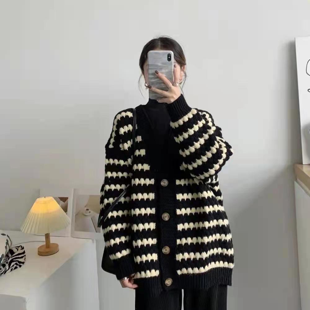 韩版V领开衫毛衣女2025秋冬新款条纹针织开衫宽松中长款外套潮