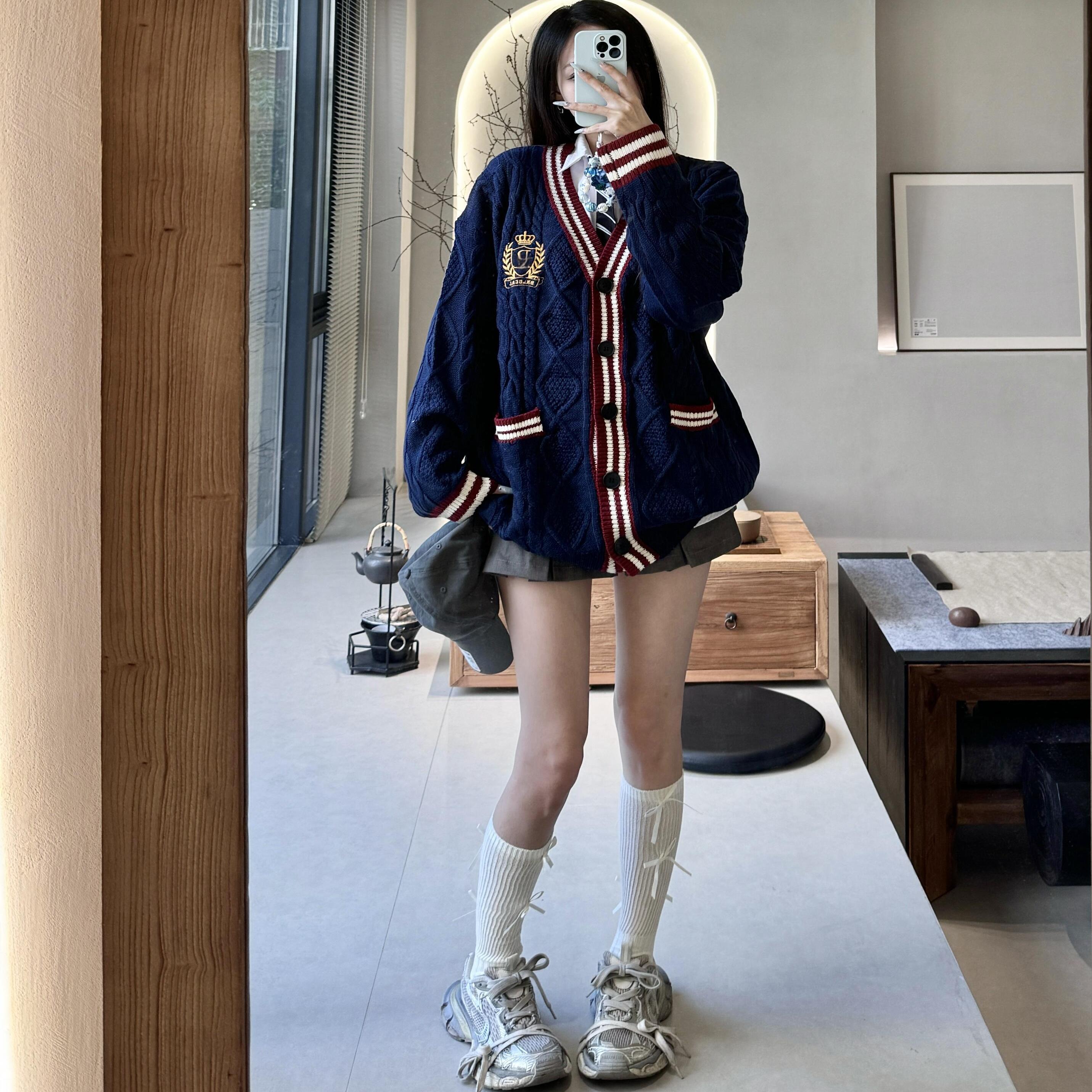 大码英伦风学院v领开衫毛衣女秋冬慵懒风软糯宽松外搭针织衫外套