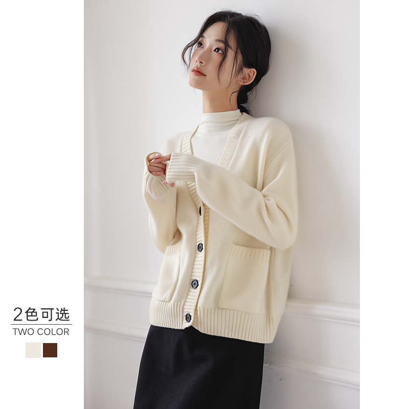反季羊毛衫女开衫V领针织外套春秋100纯色宽松短款毛衣羊绒衫