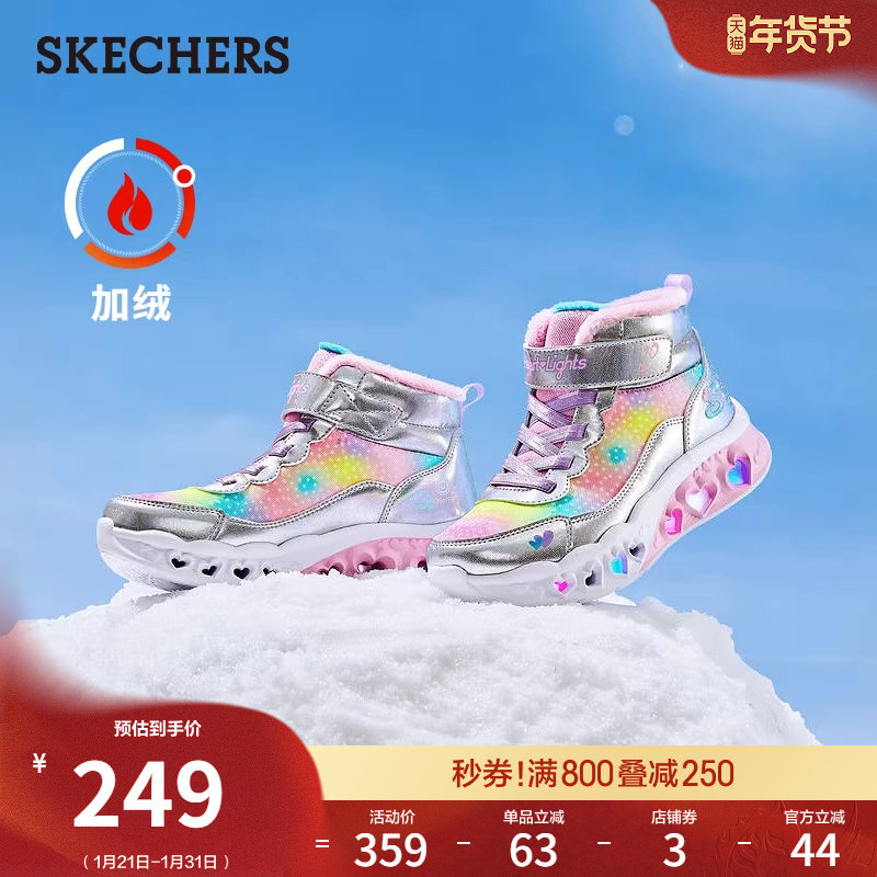 斯凯奇童鞋冬季中大童女鞋魔术贴闪灯鞋高帮休闲鞋加绒保暖雪地靴