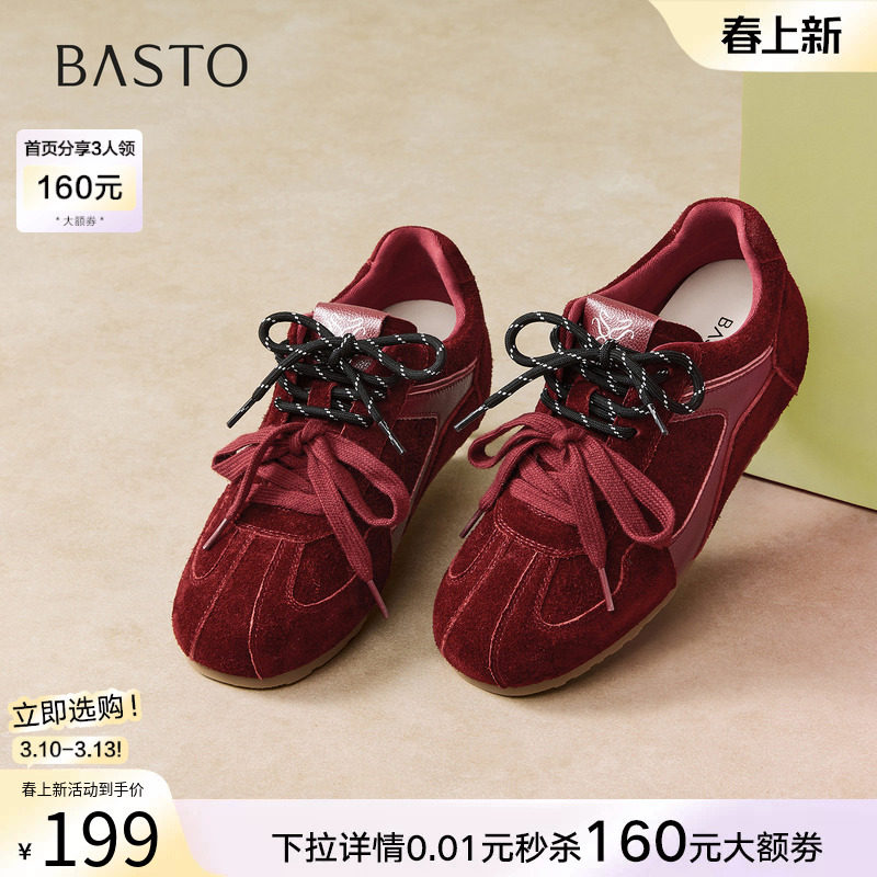 百思图2026春新款牛皮厚底内增高红色德训鞋运动休闲女鞋A9992AM6