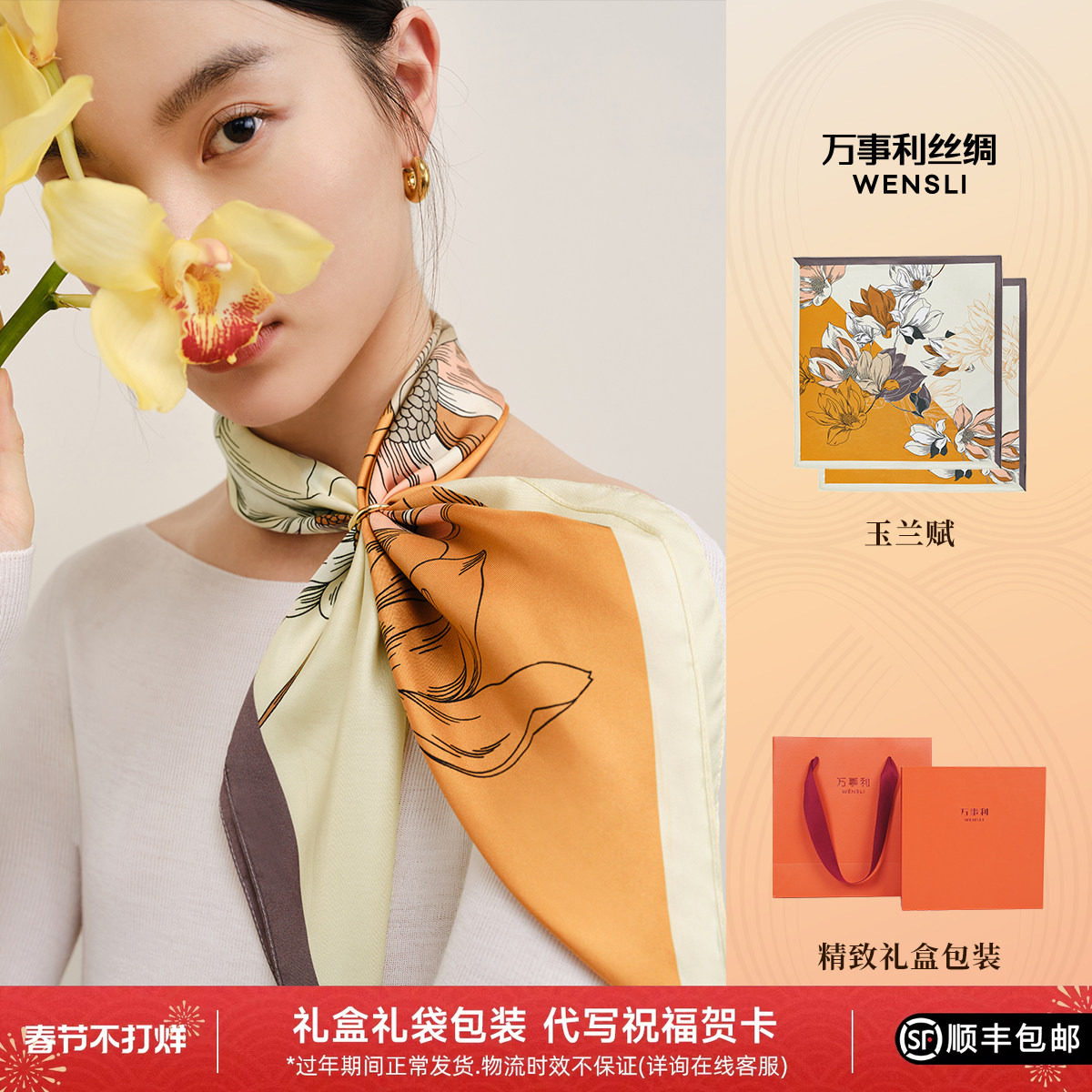 万事利丝巾扣礼盒75cm真丝方巾丝巾送妈妈送友生日闺蜜礼物玉兰赋