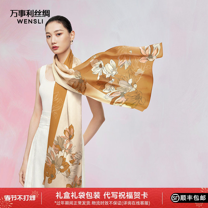 万事利真丝丝巾女桑蚕丝长巾披肩外搭仿刺绣缎面女友闺蜜生日礼物