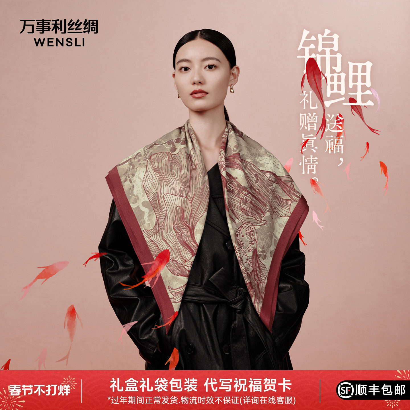 [新年礼物]万事利真丝丝巾羊毛红色围巾女送妈妈桑蚕丝披肩锦鱼绘