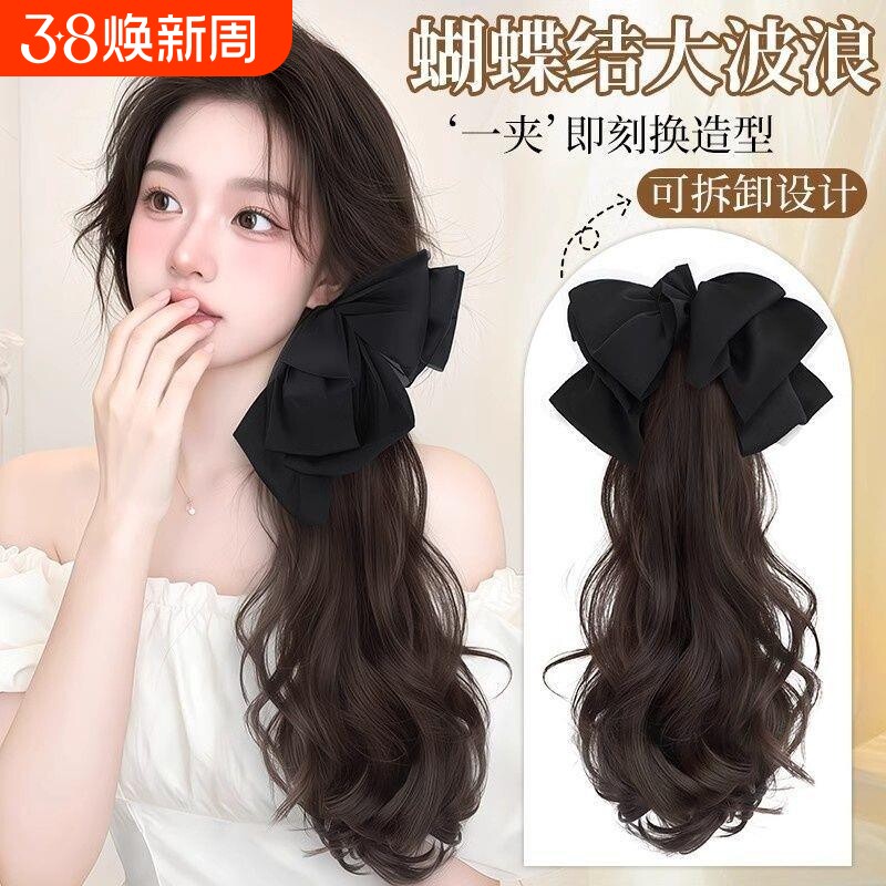 马尾假发女夏季蝴蝶结抓夹假发发饰气质蓬松长卷发低扎假发辫马尾