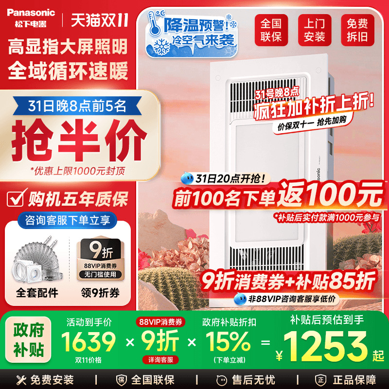 松下浴霸风暖排气扇照明一体浴室卫生间取暖器集成吊顶大白盖浴霸