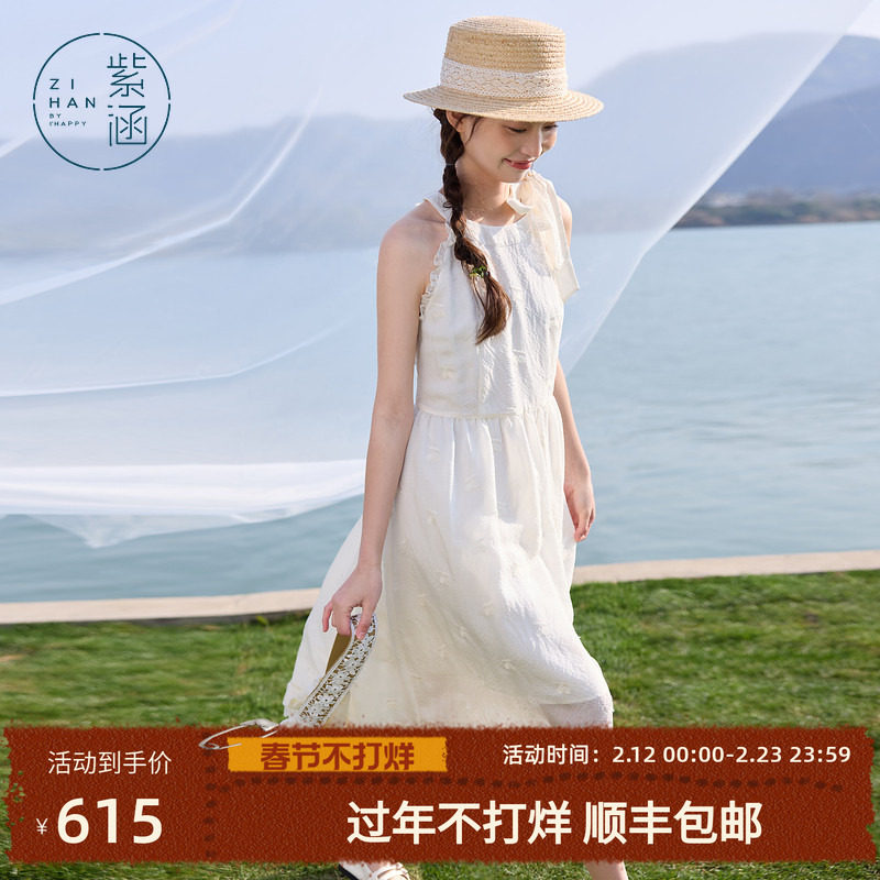 紫涵米白露肩挂脖连衣裙女士夏季新款法式甜美温柔刺绣无袖中长裙