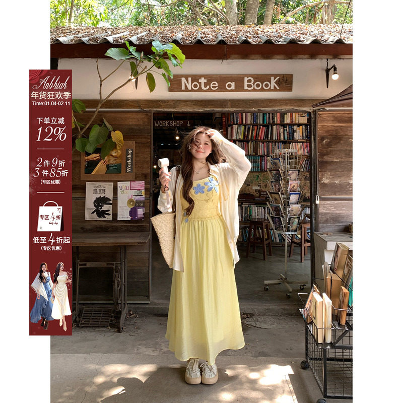 安妮不火 金盏铃兰温柔钩编花拼接吊带裙女夏季新款微胖大码长裙