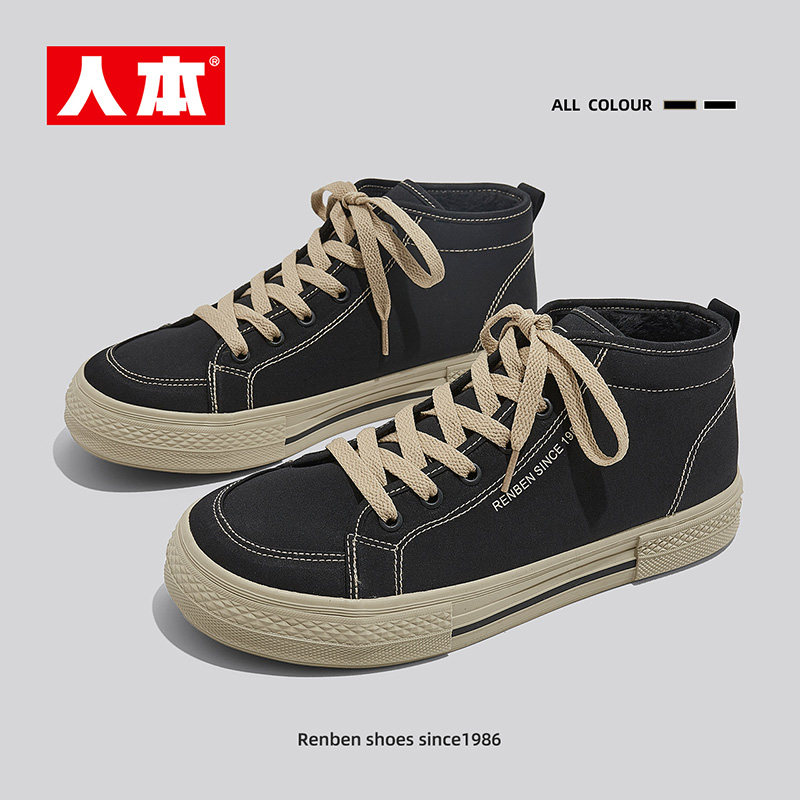 人本官方店高帮加绒保暖板鞋男2025冬季新款百搭男棉鞋男士运动鞋