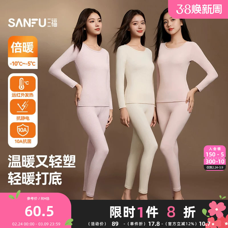 三福女冬季新款缎彩双面绒保暖内衣抗静电修身秋衣秋裤套装822285