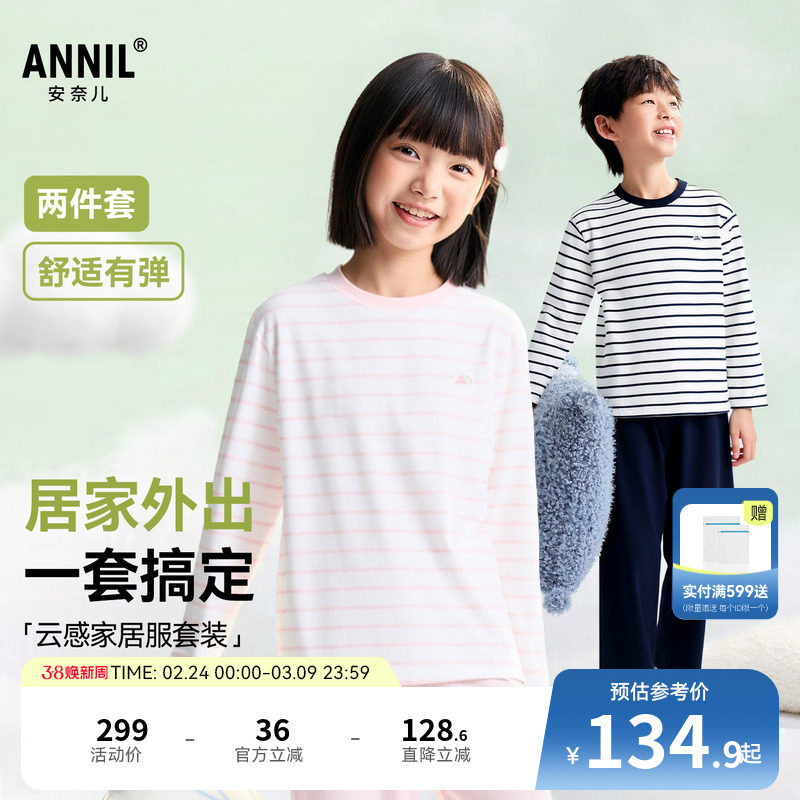 安奈儿童装男童女童圆领家居服套装2026春新款条纹时尚睡衣睡裤