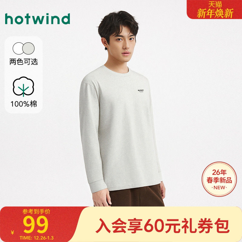 热风2026年春季新款男士圆领字母纯棉长T恤柔软亲肤舒适自在