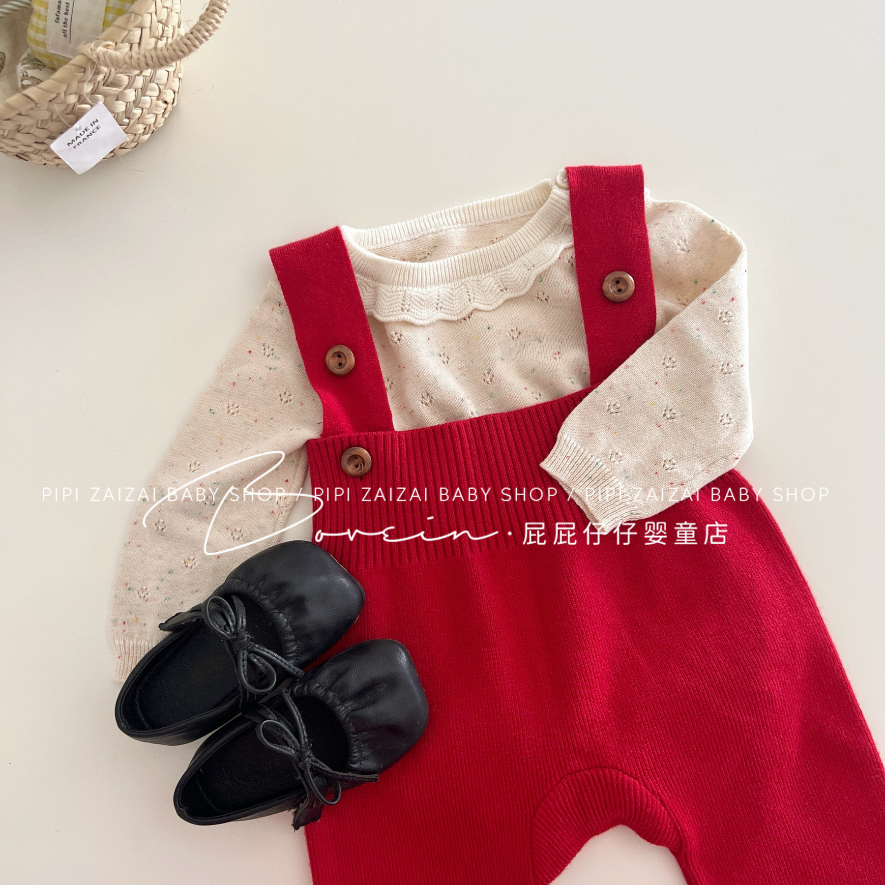 韩版冬款小香风加厚背带裤+保暖上衣喜庆婴儿爱心连体衣外出衣服1