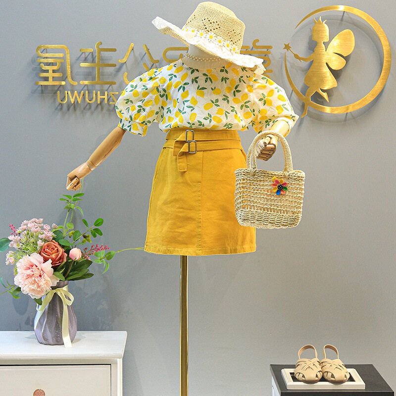 2023夏小女童印花牛仔裙套装儿童泡泡袖柠檬上衣半U身包裙两件套