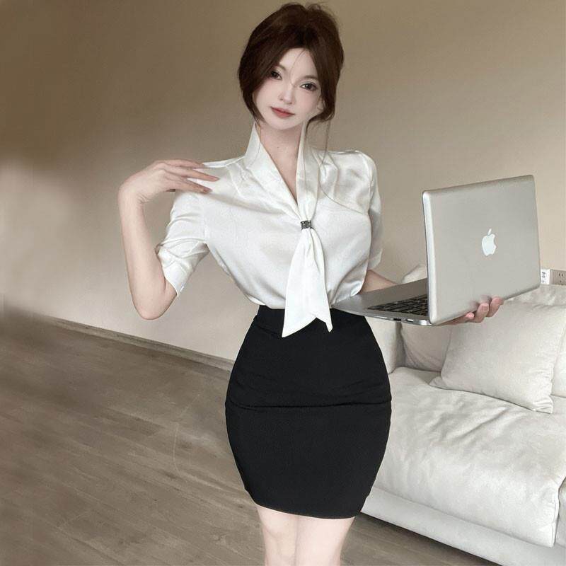 薄款短袖性感衬衫收腰制服OL职业装春季套装工作服衬衣包裙两件套
