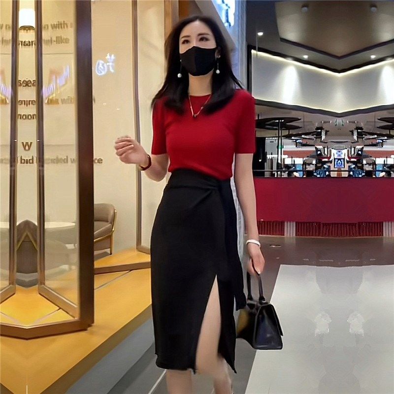 2025夏季一整套搭配套装七分袖针织上衣黑色包裙半身裙两件套装
