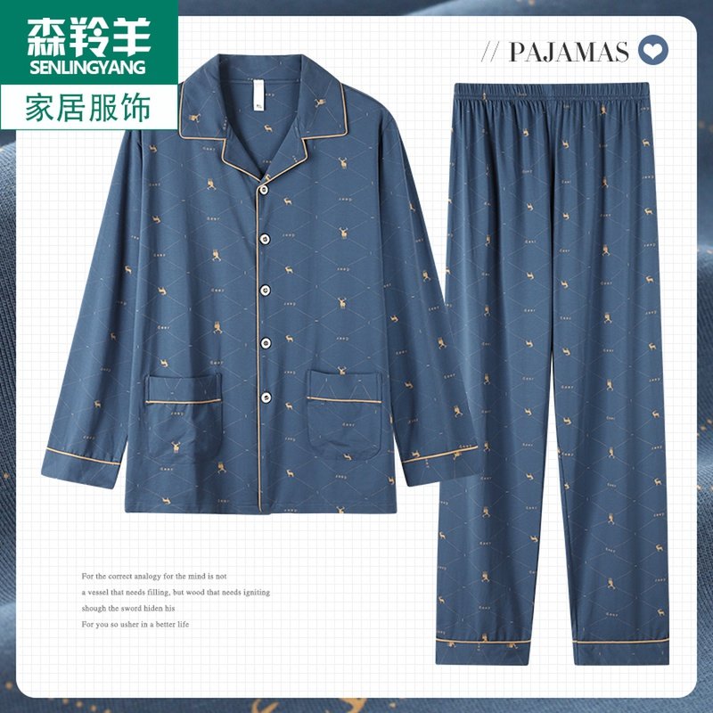 男士纯棉睡衣长袖开衫长裤中年男式全棉套装春秋款男家居服可外穿