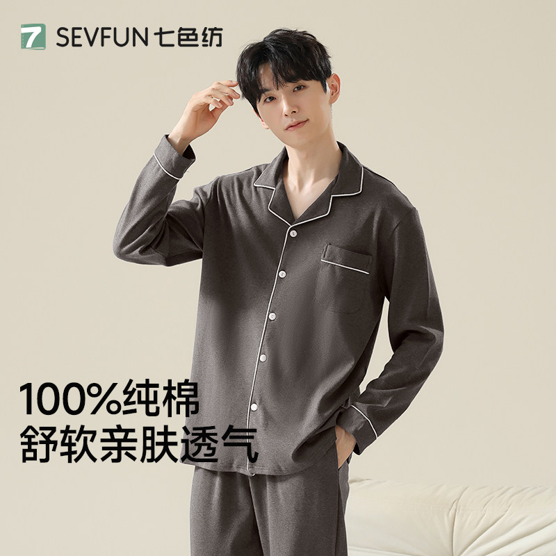 七色纺男士纯棉睡衣长袖四季通用全棉家居服套装大码可外穿春秋款