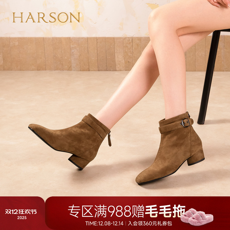 哈森气质方头绒面时装靴皮带扣通勤百搭短靴女2025冬新款HA256513
