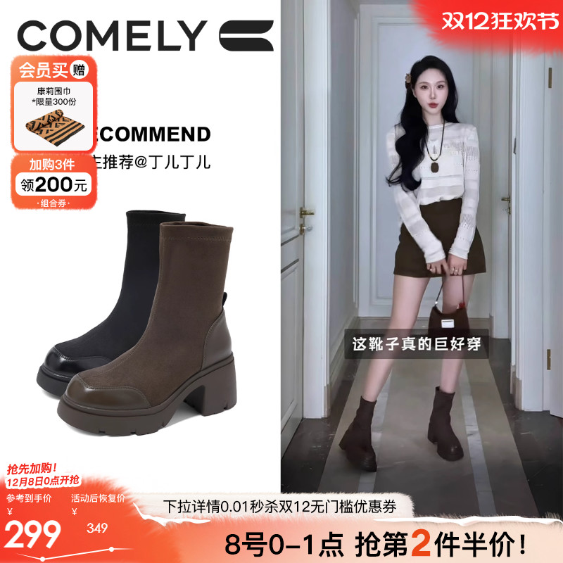 康莉弹力瘦瘦靴袜靴女秋冬小个子厚底复古圆头粗跟百搭短靴女靴鞋
