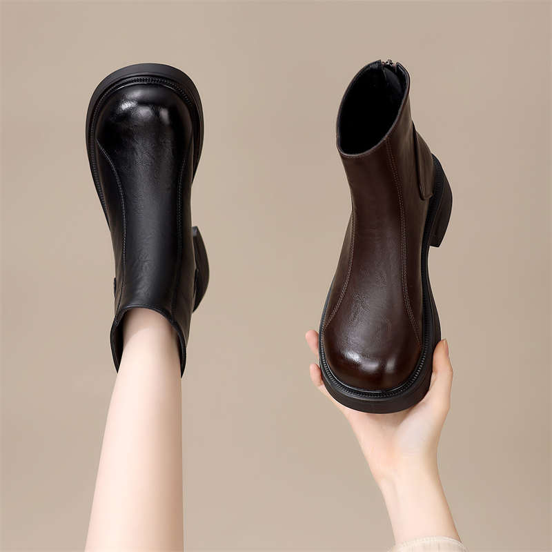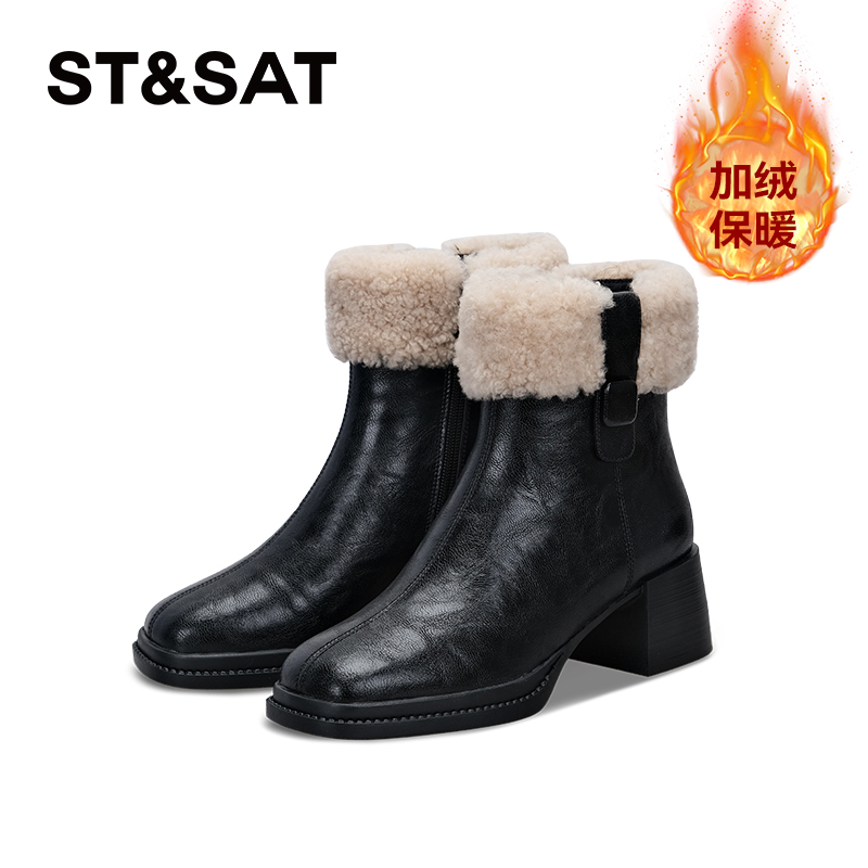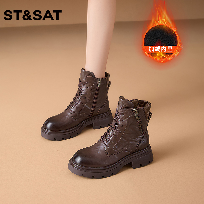 星期六厚底增高时装靴粗跟英伦气质女鞋加绒保暖复古百搭短靴女款