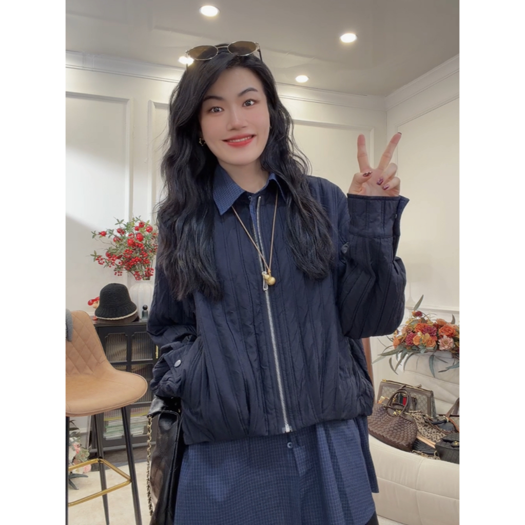 韩版圆领格纹长袖棉服女秋冬季新款时尚拼接设计感休闲百搭短外套