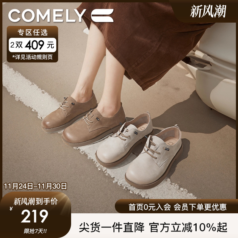 康莉真皮系带小皮鞋女2025年春季新款雕花布洛克英伦女鞋深口单鞋