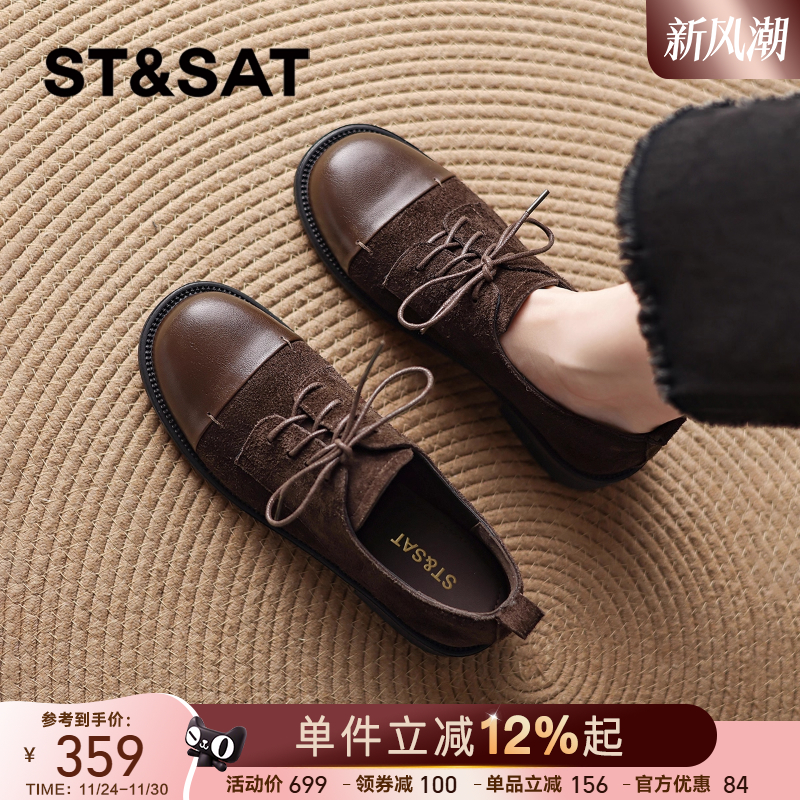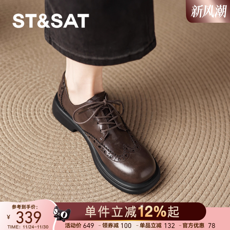 星期六真皮系带小皮鞋女2025新款秋季复古单鞋软底乐福鞋布洛克鞋