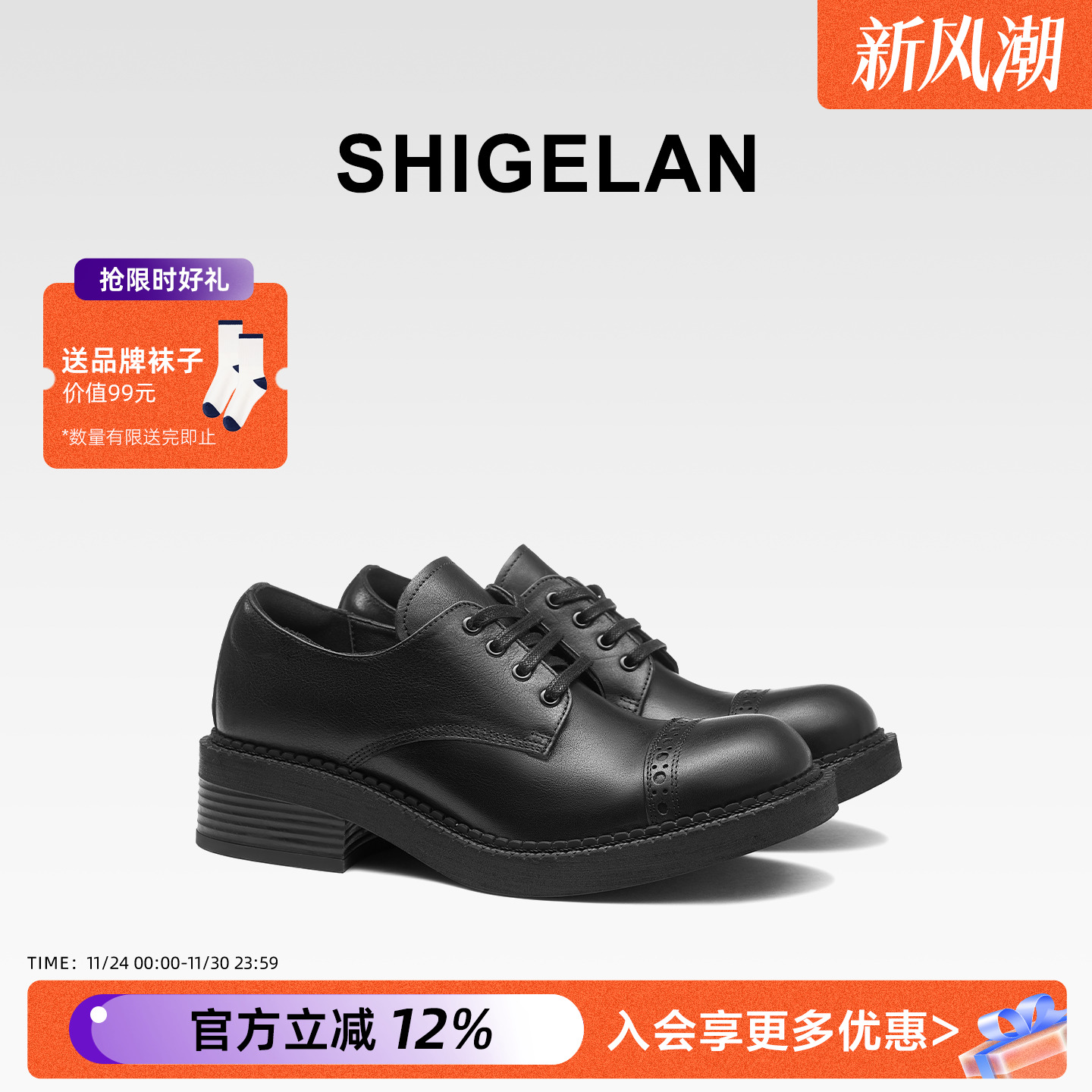 星期六棕色皮鞋女2025新款秋冬厚底系带单鞋女士乐福鞋布洛克单鞋