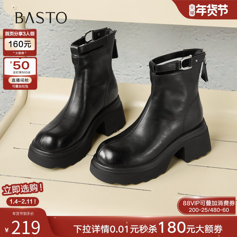 百思图2025冬季新款通勤圆头粗跟女短靴厚底增高马丁靴F2012DD5