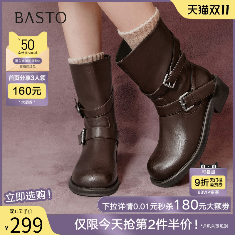 百思图2025冬季新款潮酷通勤扣带圆头粗跟短靴棕色女靴B8606DZ5