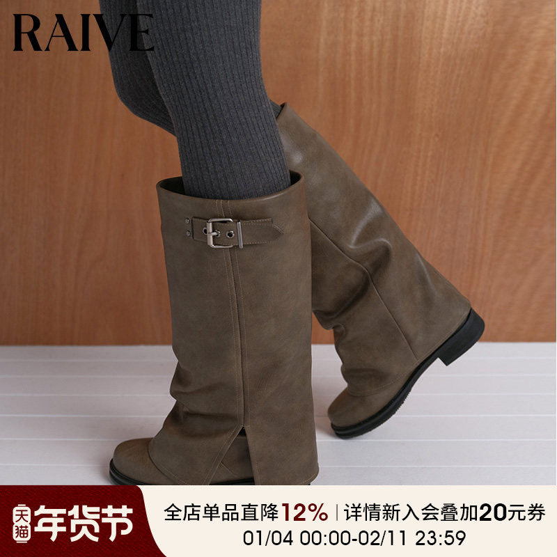 RAIVE2025冬季新款女裤管靴纯色棕色高筒靴显腿细粗跟圆头靴子