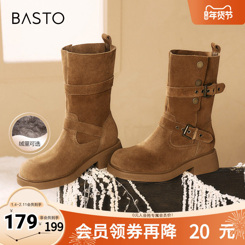 百思图冬季新款西部牛仔靴粗跟复古圆头废土风时装靴BP310DZ4