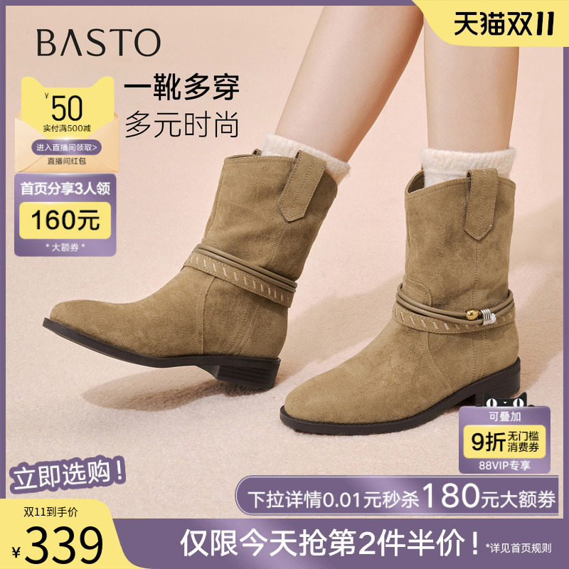 百思图2025冬季新款时尚通勤西部靴堆堆靴圆头粗跟女短靴W5861DD5
