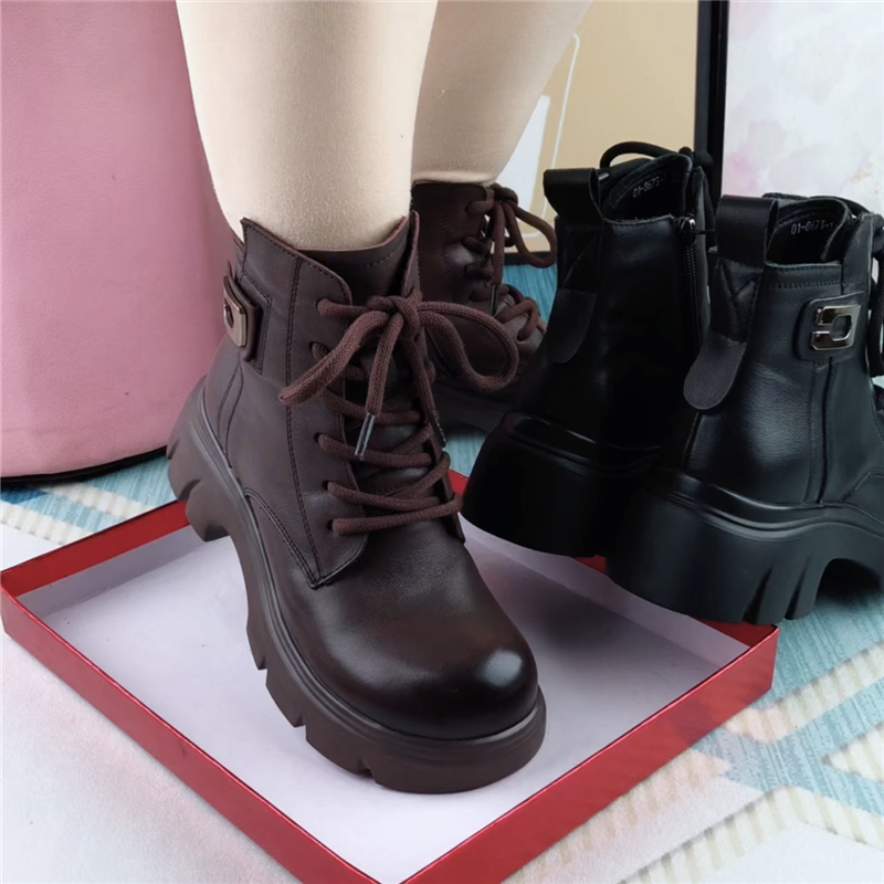 特价真皮短靴女2025秋冬新款软底软面粗跟圆头靴子英伦风马丁靴