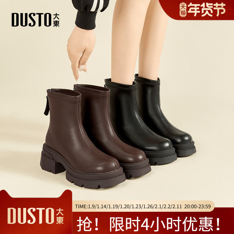 大东骑士靴女鞋2025冬季新款高跟粗跟圆头后拉链厚底小轻靴D1149A