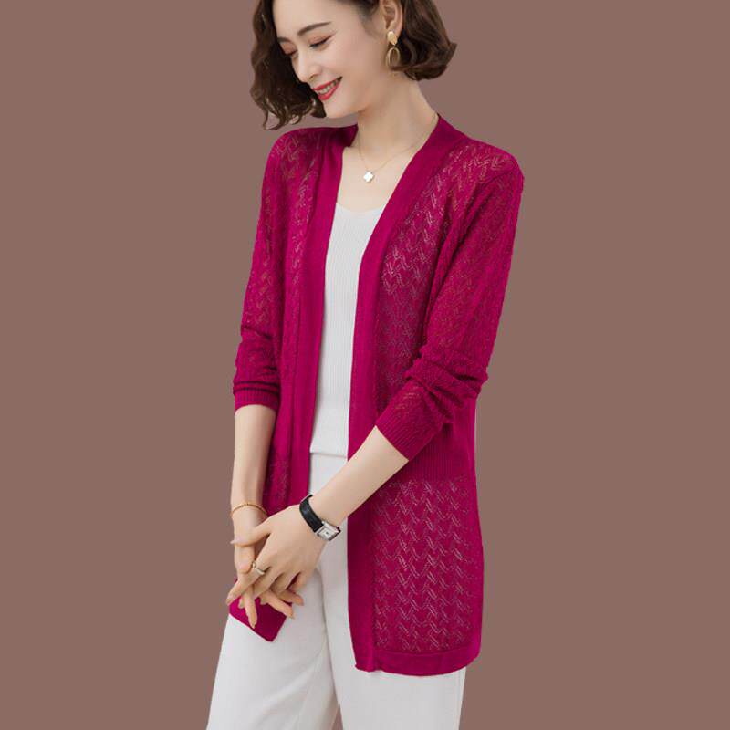 桑蚕丝镂空针织衫开衫女薄款外套妈妈中长版大尺码空调防晒衫春夏