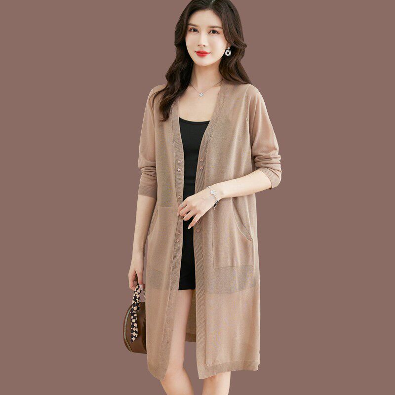 桑蚕丝冰丝针织开衫女士春夏新款薄款外搭桑蚕丝防晒衣中长款外套