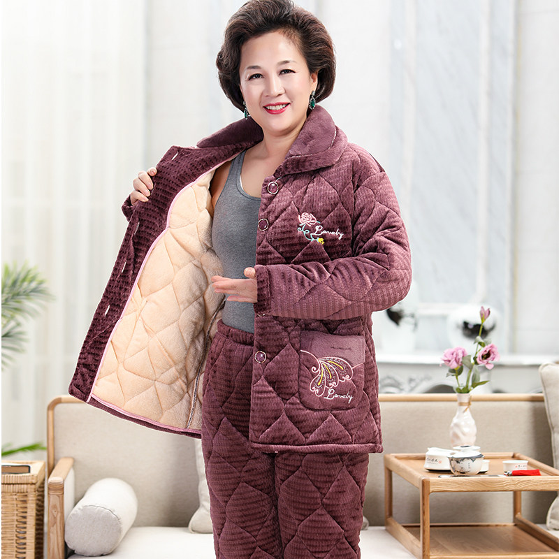 冬季珊瑚绒夹棉睡衣女三层加绒加厚秋冬款妈妈保暖中老年人家居服