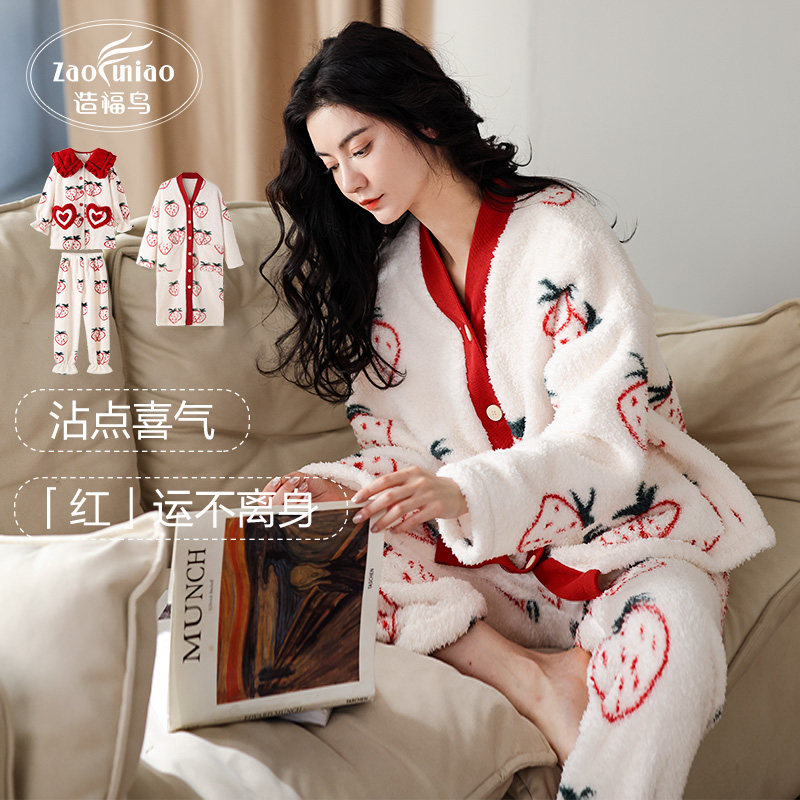 冬季加厚珊瑚绒睡衣女士新款加绒大码春秋天保暖法兰绒家居服套装