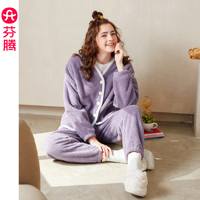 芬腾秋冬季加厚珊瑚绒睡衣女加绒保暖法兰绒大码宽松家居服套装冬