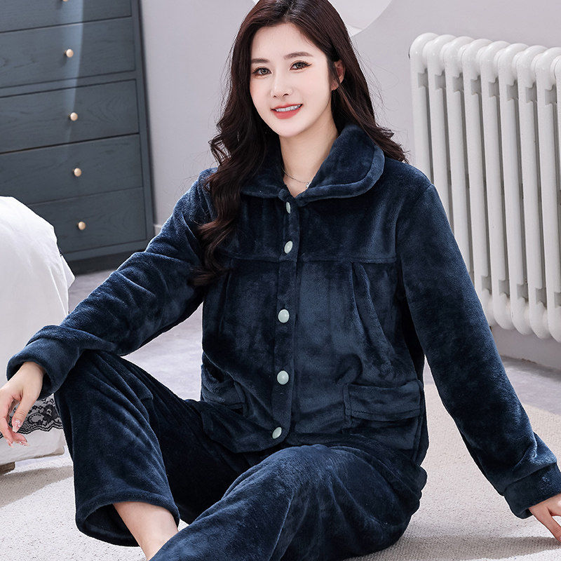 秋冬季加厚珊瑚绒睡衣女冬法兰绒加绒套装春秋开衫大码女士家居服