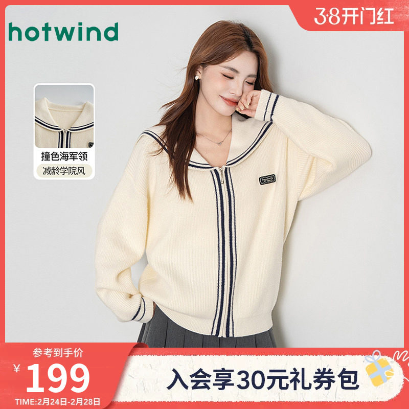 热风女士针织衫上衣复古气质减龄海军领针织外套秋冬女款毛衣开衫