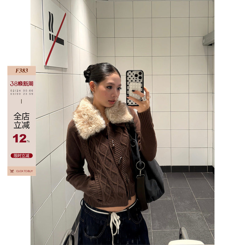 F383 美式复古菱格毛毛领毛衣牛角扣针织麻花女款修身开衫外套ins