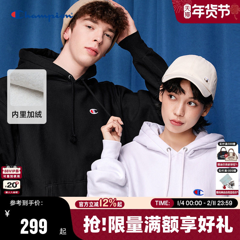 Champion冠军连帽卫衣男秋冬加绒红色情侣美式风女宽松休闲秋潮牌