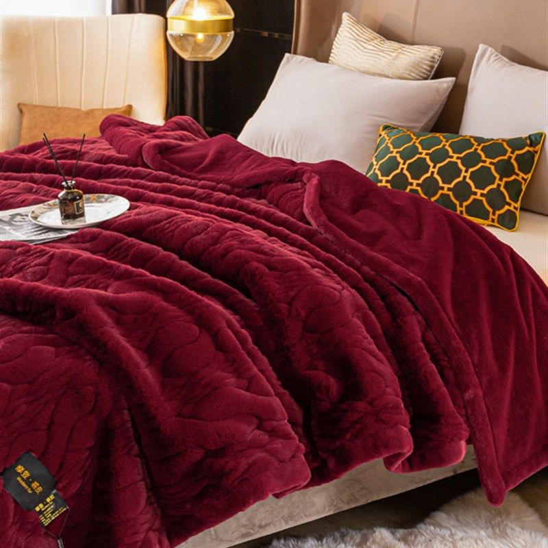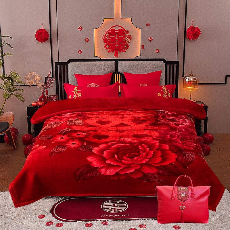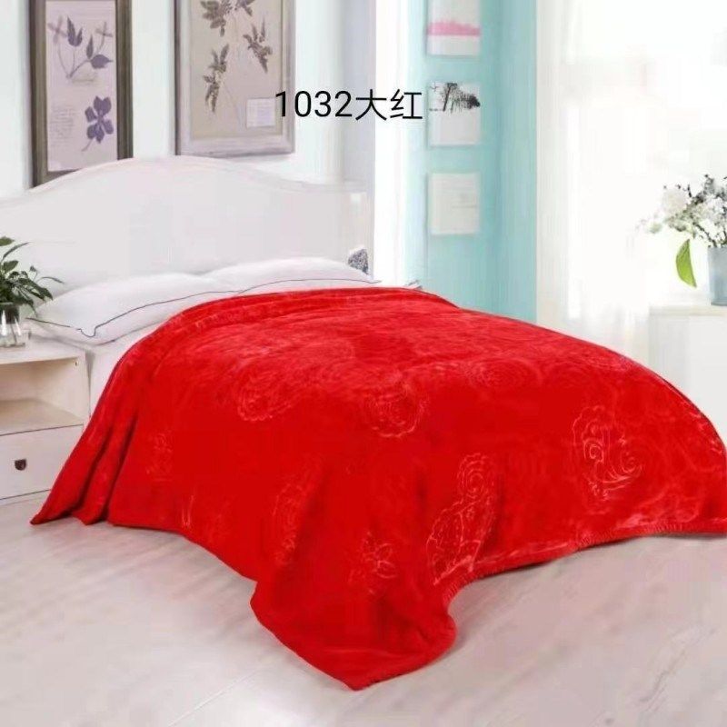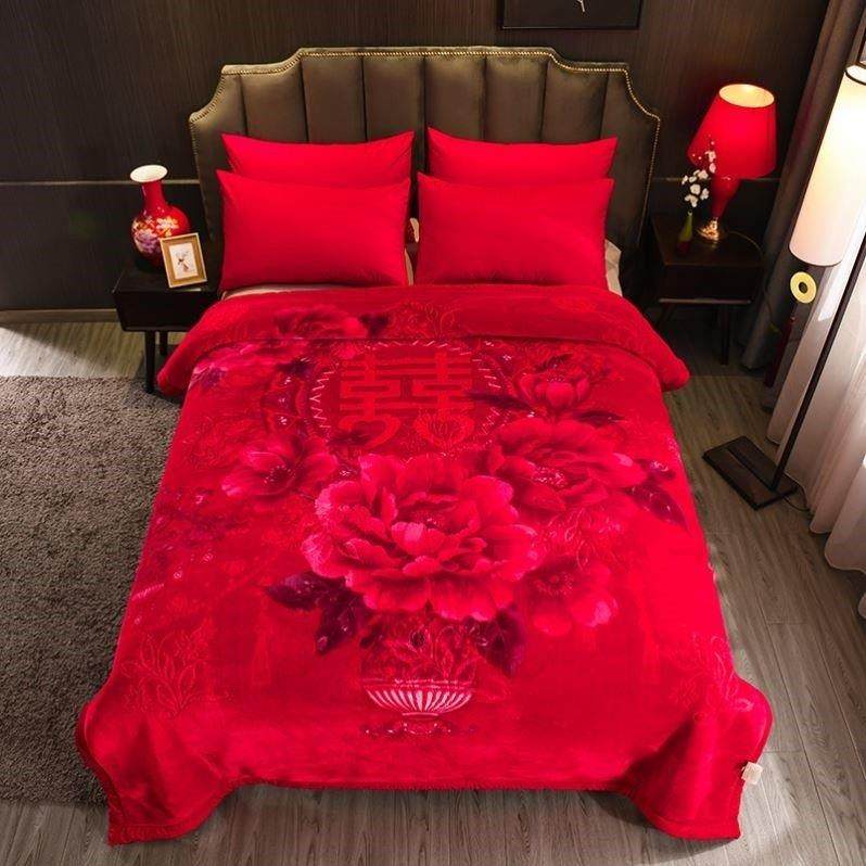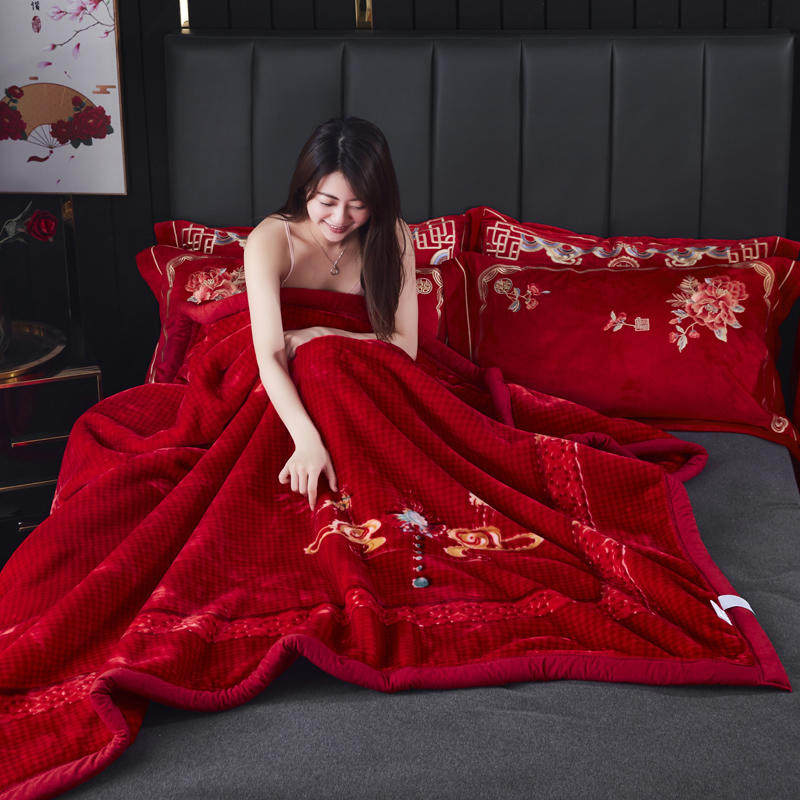 加厚拉舍尔保暖婚庆毛毯简约双层大红色压花双面加厚婚庆铺床送礼