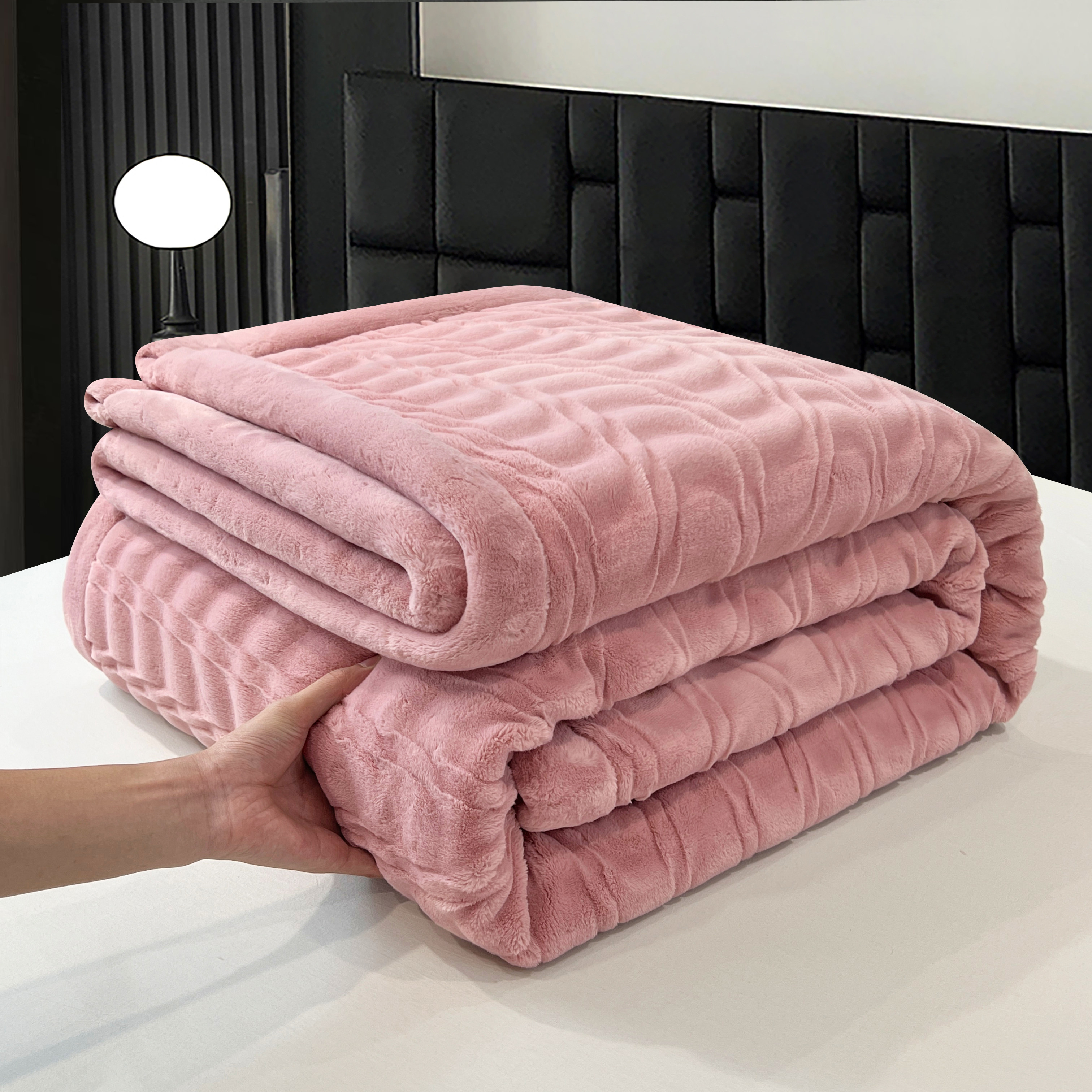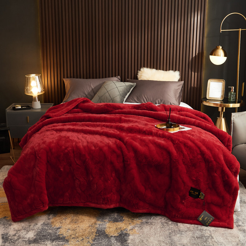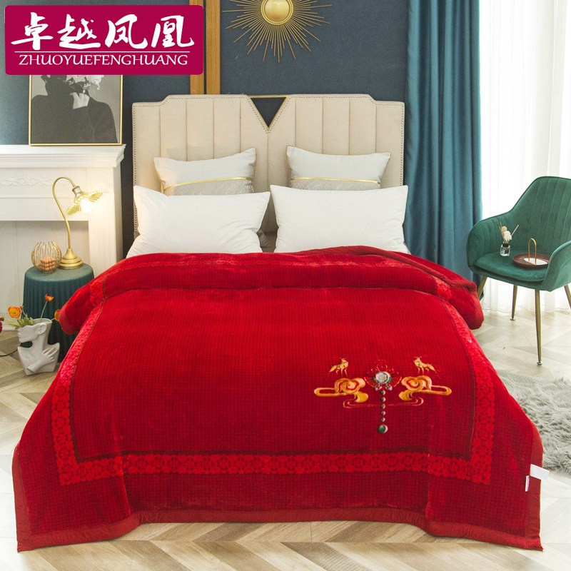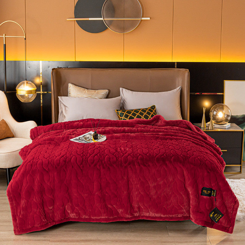 加厚拉舍尔保暖婚庆毛毯简约双层大红色压花双面加厚婚庆铺床送礼