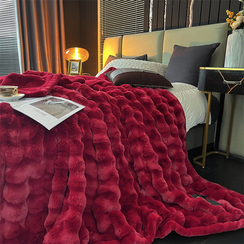 高档婚庆毛毯冬季保暖盖毯加厚双层彷裘皮草毯喜庆毯子酒红色送礼